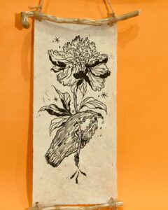 @le_blobfish_sauvage : petit porte étendard à acrrocher chez soi, avec linogravure d’un dessin original, une petite poésie de l’étrange