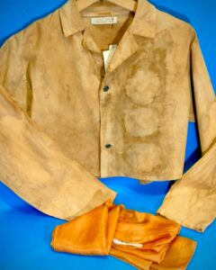 @porte_empreinte_textile : veste up-cylclée en coton et délicate étole en soie, teintes par les soins de la créatrice avec des plantes glanées et réactifs oxydants pour des couleurs pleines de caractère !