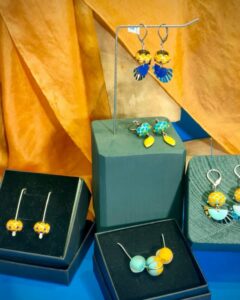 @pauline.roques_ : bijoux en perles de verre filées au chalumeau, aux jolies couleurs contrastées du verre de Murano, savamment choisies et mélées en motifs d’écaille pour une allure moderne et japonisante !